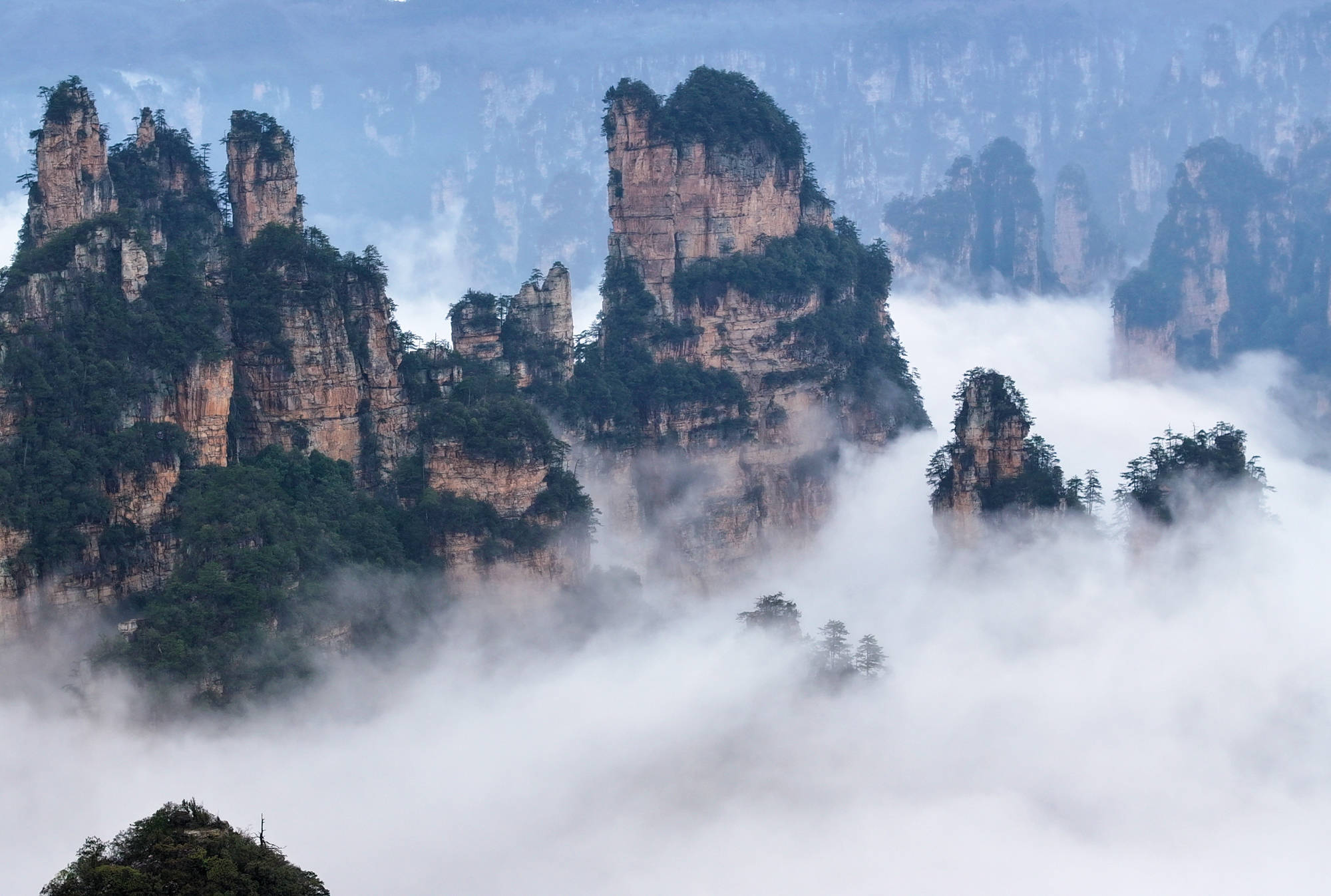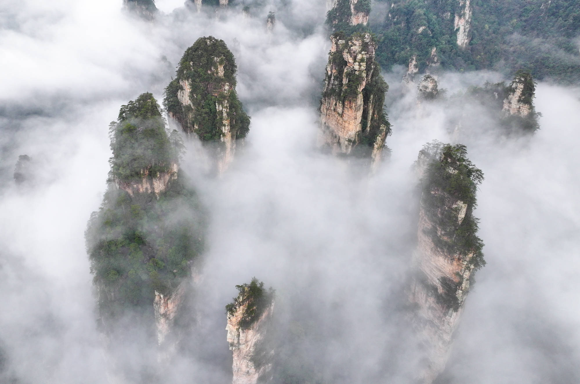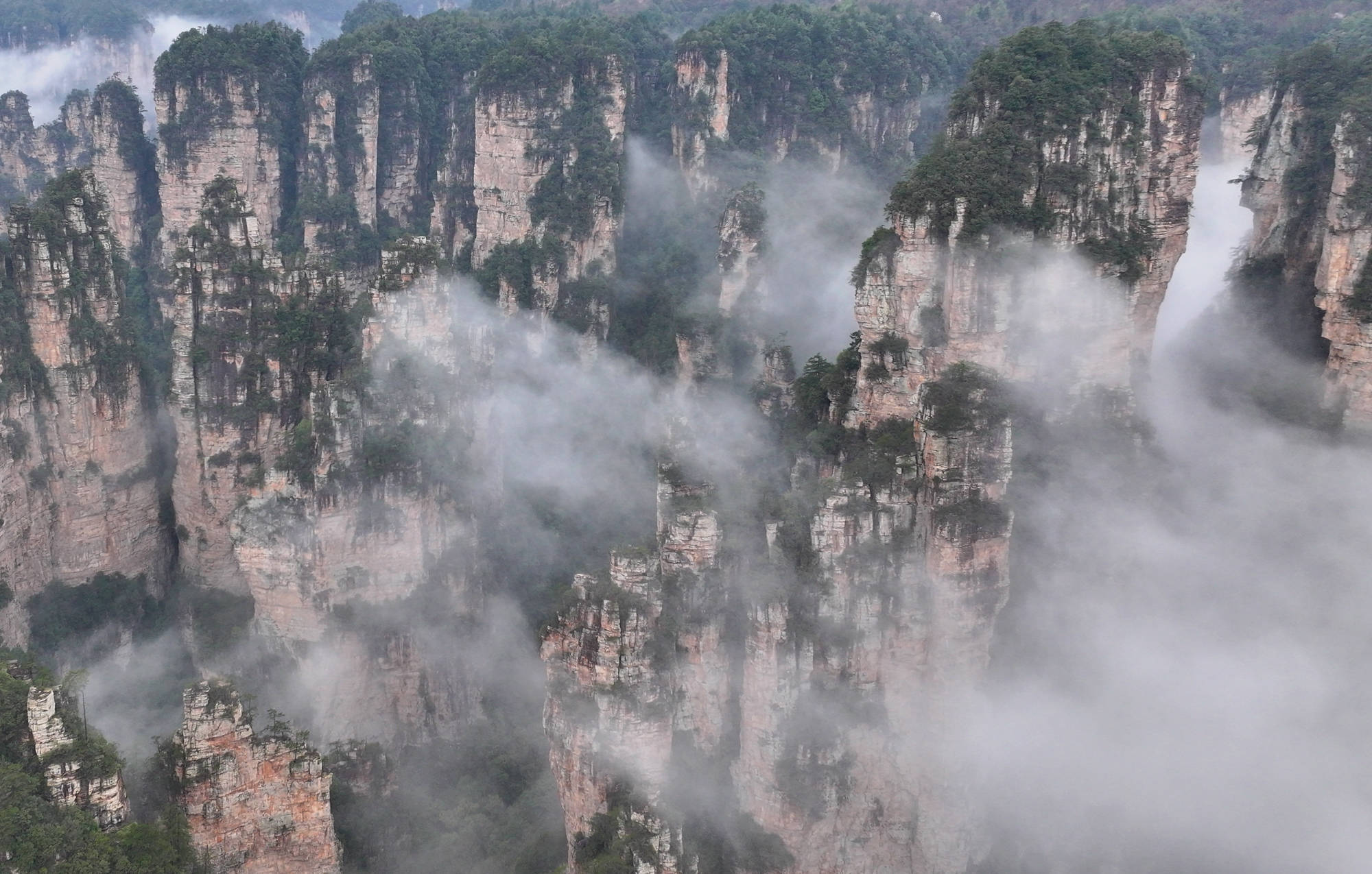 2026年3月27日,一场春雨过后,湖南张家界国家森林公园出现壮美的云海景观,洁白的云雾在陡峭的峰林间蒸腾变幻,宛如水墨画卷。